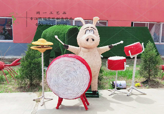 产品名称:稻草工艺品卡通猪打架子鼓造型
